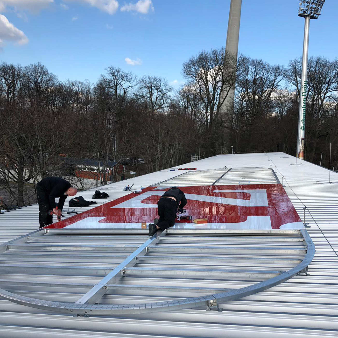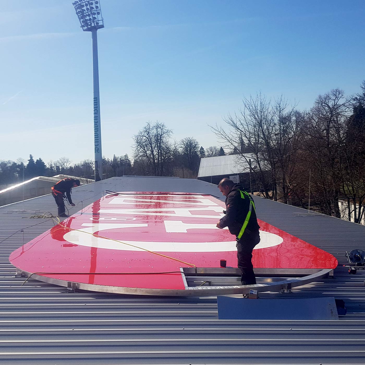 Für das Gazi-Stadion auf der Waldau wurde zur besseren Sichtbarkeit des Sponsoren Gazi eine Großwerbeanlage auf dem Tribünendach montiert. Durch den öffentlichen Veranstaltungsort, waren sicherheitsrelevante Vorgaben inkl. einer Prüfstatik Voraussetzungen für die Ausführung des riesengroßen Werbeschildes.