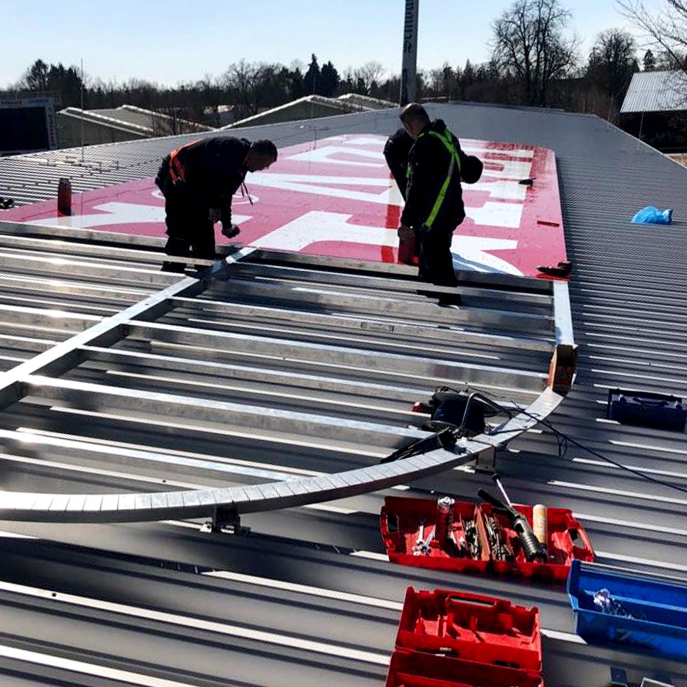 Werbeschild XXL: Es wurde eine Tragekonstruktion aus Aluminium konstruiert, auf dieser wurden folienkaschierte Alu-Verbundplatten aufgenietet.