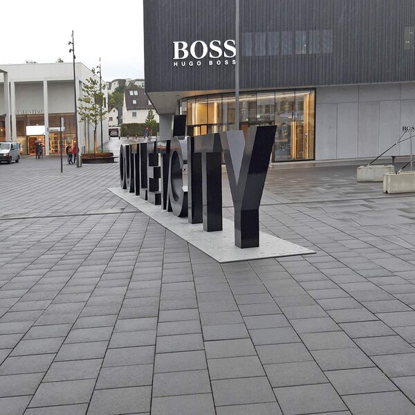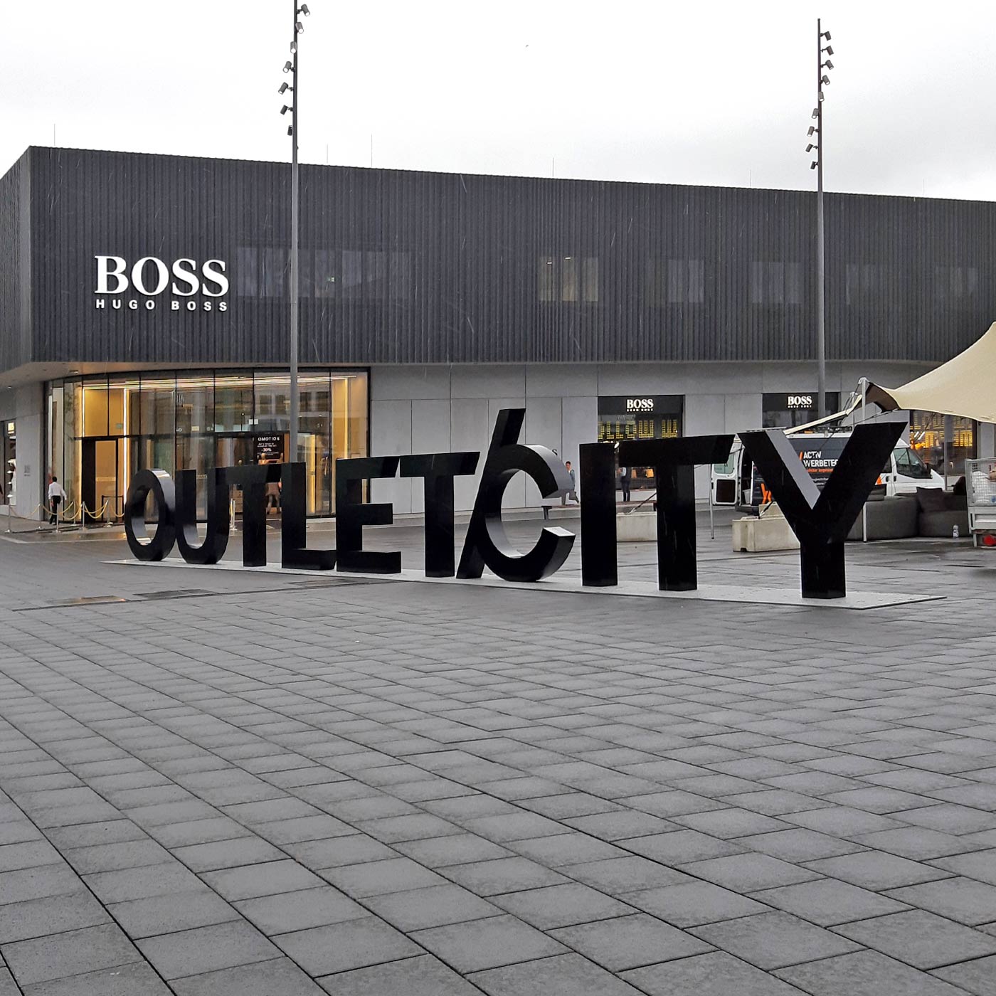 Der beliebten Outlet City Metzingen ging es vor allem darum einen EyeCatcher für den Außenbereich zu kreieren. Vorgabe war einen Schriftzug zu bauen, der so stabil konstruiert wird, das Kinder und auch Erwachsene die Buchstaben begehen können ohne das die Schriften Beschädigungen aufweisen. Ein weitere Vorgabe war das die Buchstaben einzeln auf Fußplatten aus Stahl befestigt sind und ein transportabler Einsatz jederzeit möglich ist.