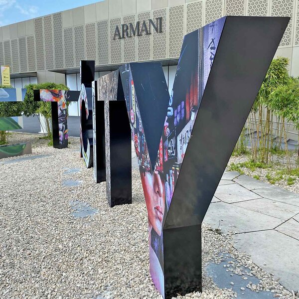 Freistehende Buchstabenanlage: Die Einzelbuchstaben sind 1.800mm hoch, der Schriftzug OUTLET/CITY ergibt eine Gesamtlänge von 18.000 mm. Die Schriftzüge können rund um die Outlet City eingesetzt werden, da sie ohne größeren Aufwand von einem Spot zum nächsten transportiert werden können. Obwohl sie fast überall aufgestellt werden können, sind die Buchstaben jeweils so stabil gebaut, dass man sich ohne Probleme hineinsetzten kann. Zudem wird dieser Schriftzug saisonal individuell mit Folientechnik bedruckt. Gerne wird die Werbeanlage auch als Selfie Point von Besuchern genutzt, was natürlich auch eine große Werbewirkung in Social Media Kanälen mit sich bringt.