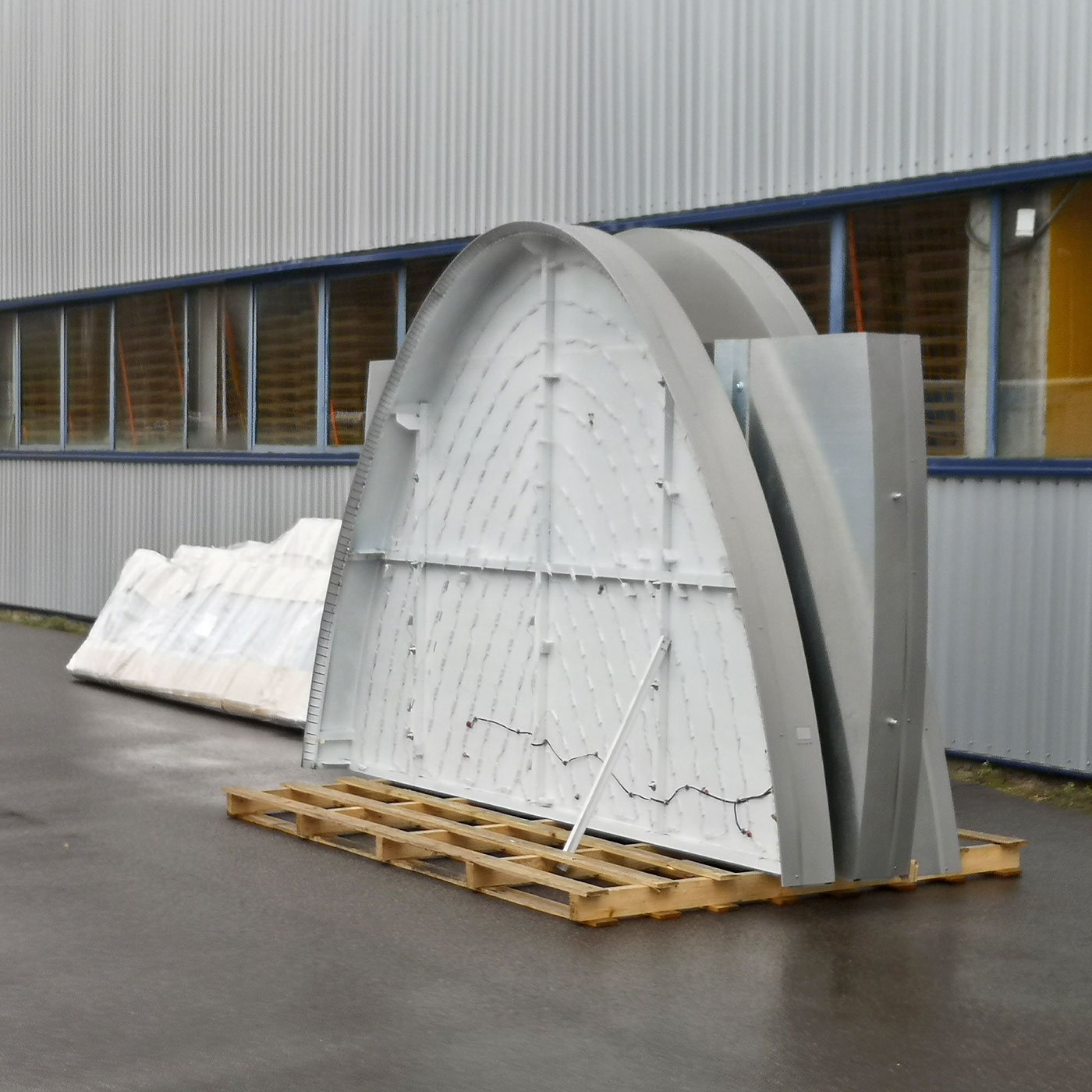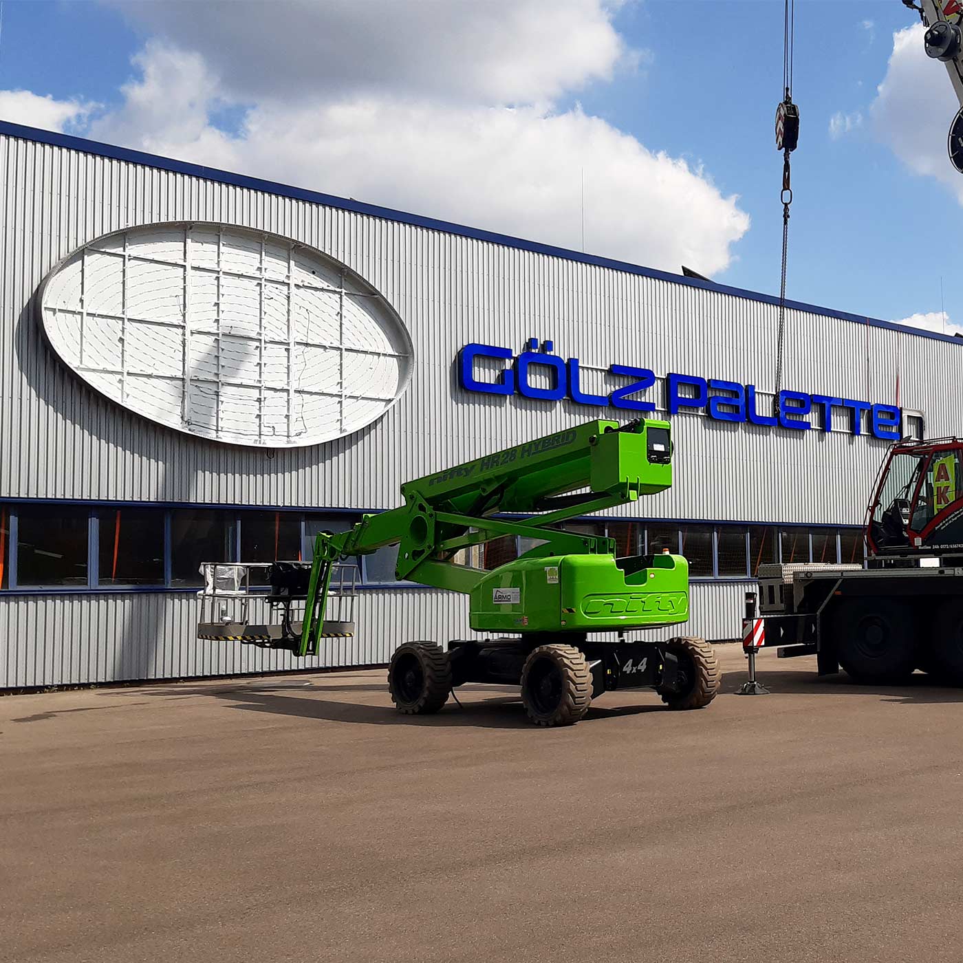 Für die riesengroße Produktionshalle der Fa. Gölz Paletten durften wir ein Gebäudebranding mit Markenkennzeichnung entwickelt. Aufgabenstellung war, den Logoschriftzug als Lichtwerbeanlage auf dem 170m langen und 80 m breiten Gebäude so groß darzustellen, dass der Schriftzug von der Autobahn A8 gut sichtbar ist. Hierzu war eine detaillierte Planung inkl. Statik gefordert. Die riesigen Schriftzüge wurden mit einer Stahl-Riegelkonstruktion im Inneren des Gebäudes abgefangen.