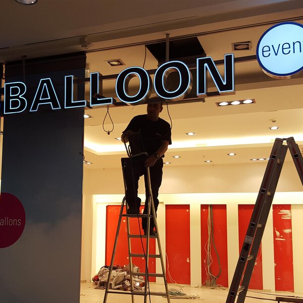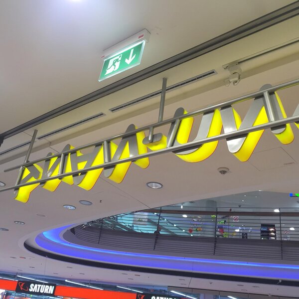 Die Ausführung der Leuchtschriften erfolgte als Deckenhänger mit einer 2-reihigen Unterkonstruktion, die Leuchtbuchstaben in Profil 5 als Frontleuchter.