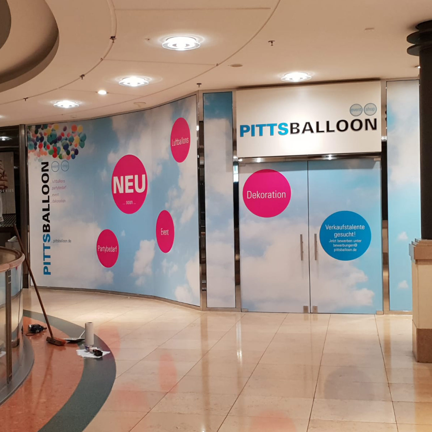 Wenn es um Werbemaßnahmen für den Einzelhandel geht ist Flexibilität und Schnelligkeit angesagt. Kurzfristig konnte von PITTSBALLOON Stores in Stuttgart und Ludwigsburg angemietet werden. Innerhalb von 3 Tagen wurde die Dekofolien als Vorankündigung für die Eröffnung auf die Schaufenster aufkaschiert und innerhalb von 14 Tagen wurden von ACTIV Lichtwerbung die Leuchtschriften geplant, gefertigt und rechtzeitig ein Tag vor der Eröffnung montiert.