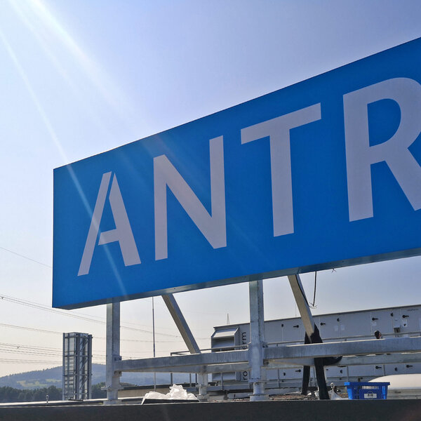 Im Zufahrtsbereich zum Parkplatzgelände wurde ein Werbepylon im Format 2,5m x 1,5m installiert. Die intern beleuchtet Frontseite des Pylons wurde als Marken und Informationsträger ausgebildet. Die Befestigung erfolgte mit 2 Flanschplatten die auf dem Betonfundement fest verankert wurden.