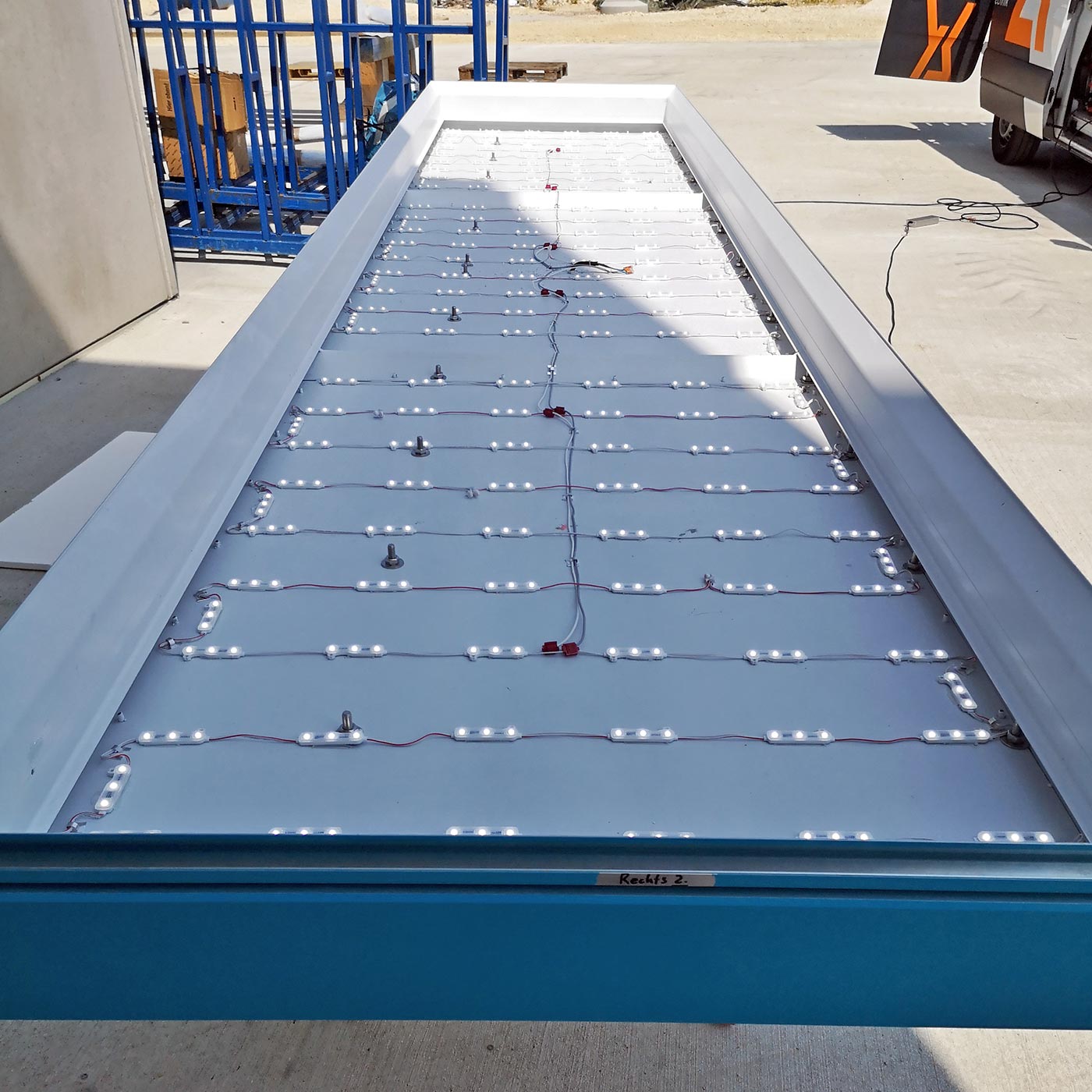 Es wurde eine Haltekonstruktion mit 4 Füssen mit Schrägabstützung und Flanschplatten zur Befestigung auf dem Betondach konstruiert. Die Werbeanlage wurde in Spanntuchtechnik ausgeführt, innenliegend mit energieffizienter LED-Technik ausgerüstet und anschließend mit einem Spezial-PVC Banner nahtlos und faltenfrei bespannt. Die Haltekonstruktion wurde auf Dachkonsolen montiert, die zuvor vom Stahlbauer bauseitig nach unseren Vorgaben gefertigt wurden. Die Dachwerbeanlagen wurde im Format 6.500 x 1.040 mm installiert.