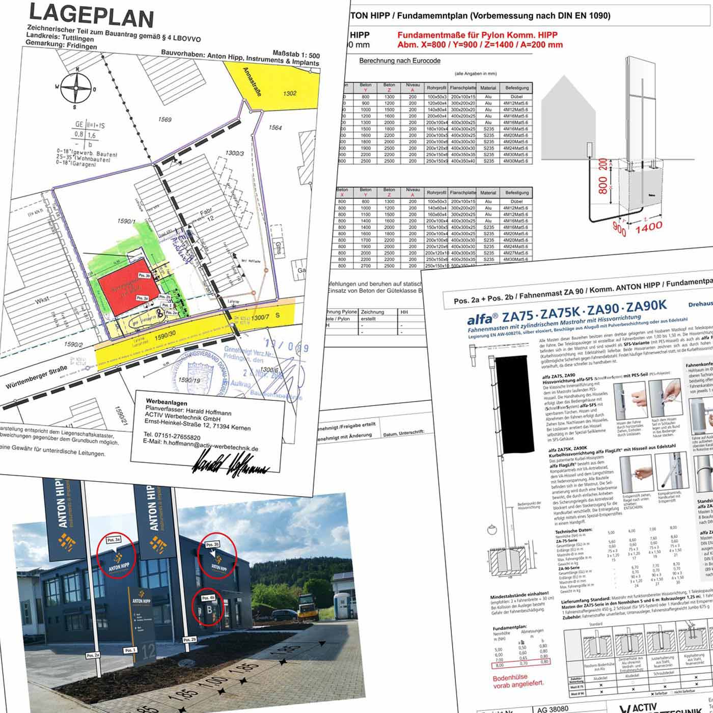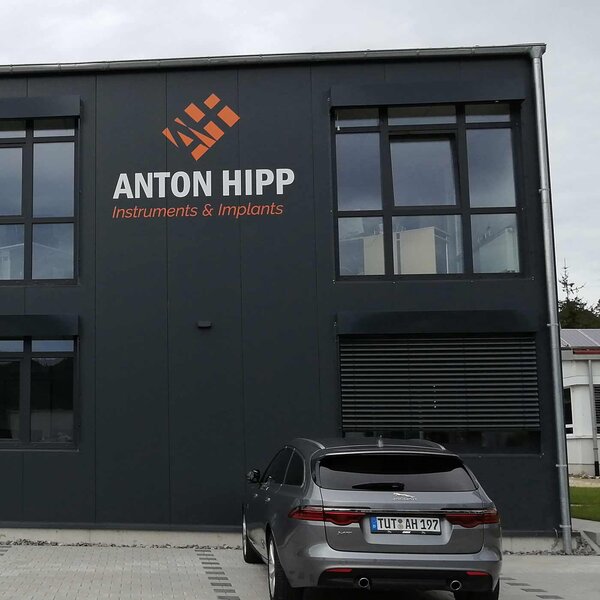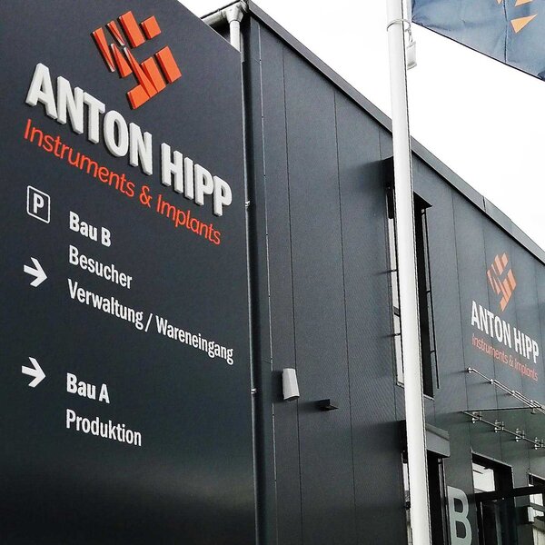 ANTON HIPP wurde einfach aber wirkungsvoll auf die Fassade beschriftet. Weiter wurde ein hochwertiger Werbepylon sowie Werbefahnen montiert.