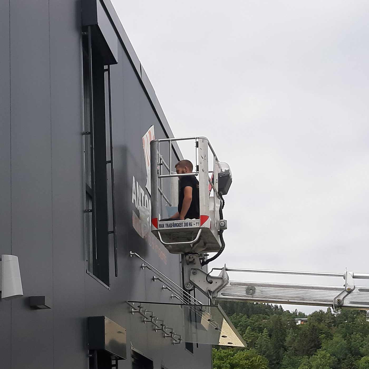 In Folientechnik wurde großflächig das Logo auf die Aluminium-Sandwich Fassade aufkaschiert. Die Position und die Größe des Logos wurde in der Planungsphase genau ermittelt und optisch an der horizontalen Fluchtlinie des inneren Fensterrahmens aufgehängt.